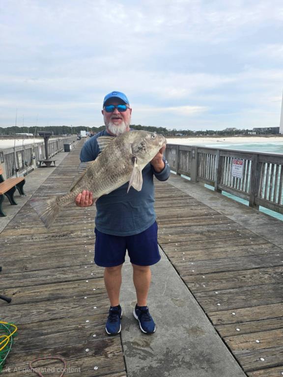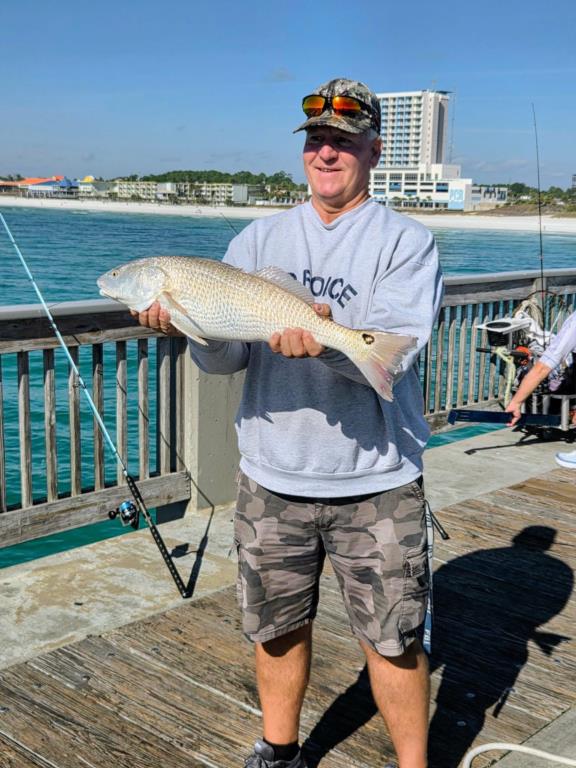 Tuesday: water temp 62.6 ESE 6-9mph in the a.m. / 63.7 SSW 3-5mph in the p.m. The water was clean.  Red Drum were the activity of the day. Terry caught a heartbreaker that was ¼ inch too big and Jack caught a slot. Then this young lady caught her first pier fish, a Big Ugly on a Pompano rig. (see: Terry-8-69f92e90; 9-6f558c46; 10-732ace7)