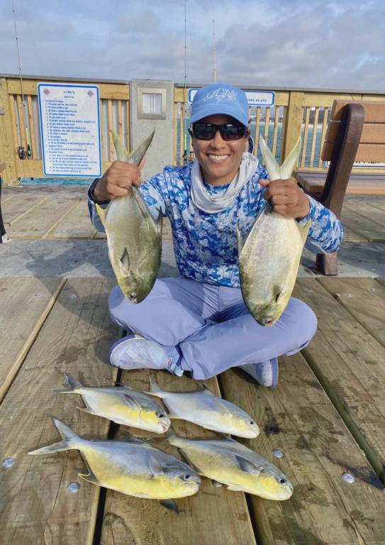 Wednesday 08th: water temp 67.8 ENE 5-13mph in the a.m. / 68.9 ESE 8-18mph in the p.m. The water was clean. There was a 30-minute Bonita run early in the morning. Spanish Mackerel were caught throughout the day, but they were scattered. The Pompano bite was good just after daylight. Brenda and a couple of other anglers reached their limit. The remainder of the day, a few more were caught. Squid were there all day. Renee shows a triple she caught.