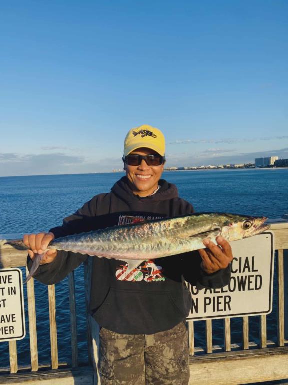 Friday: water temp 80.1 NE 10-20mph in the a.m. / 80.6 12-20mph in the p.m. The water was clean. There were 6 snake King Mackerel caught this morning like this one Brenda got. Nory caught the biggest one that weighed 8.1-pounds. Only a few Spanish Mackerel and Ladyfish were caught today. Shane caught and released a small Sailfish. There were Cigar Minnows available for live bait.