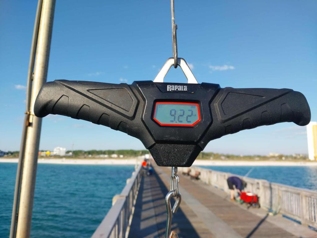 Wednesday: water temp 78.4 NE 6-9mph in the a.m. / 79.9 WSW 7-9mph in the p.m. The water was clean but had a tinge of silt. The morning was dead except two Spanish Mackerel and some Hardtails. The afternoon started slowly but, at about 4:15, we had a short King bite. I got hit first and decked an 11.16-pound King using a Cigar Minnow. Then Jackie K. decked a 9.22-pound King on a spoon. This bumped Dom and moved Jackie into second place in the Tournament. Dom then got an undersized King using a jerk bait.