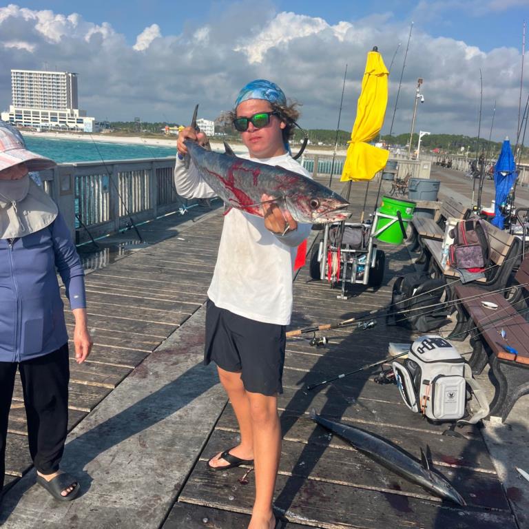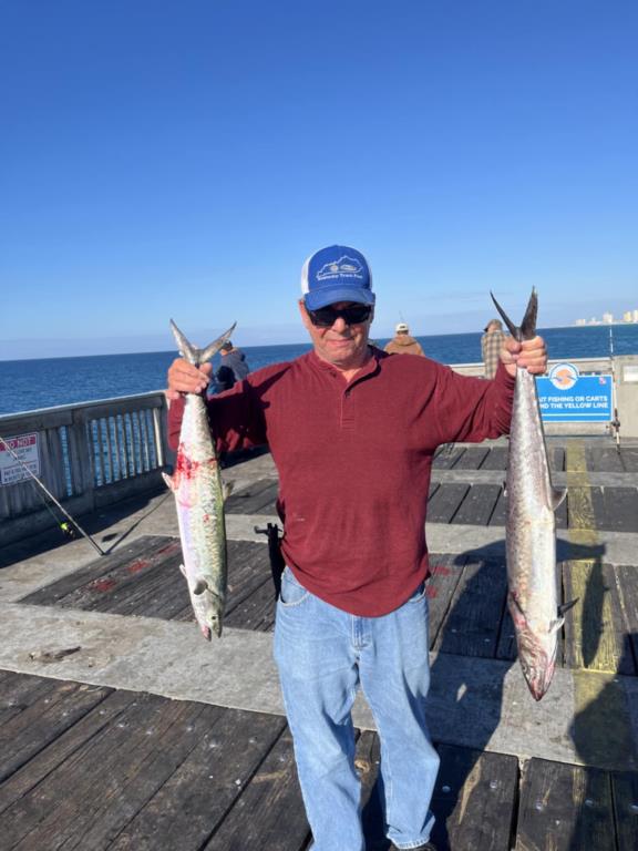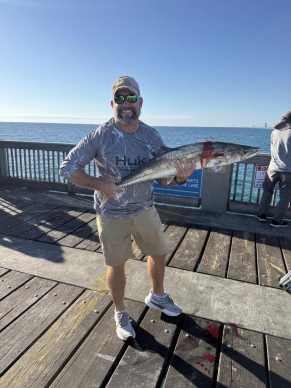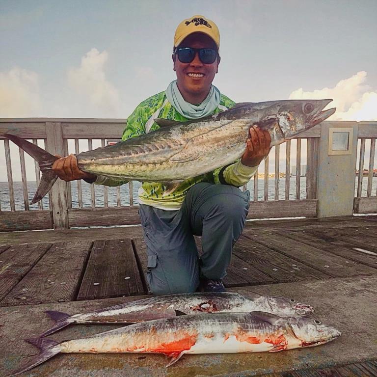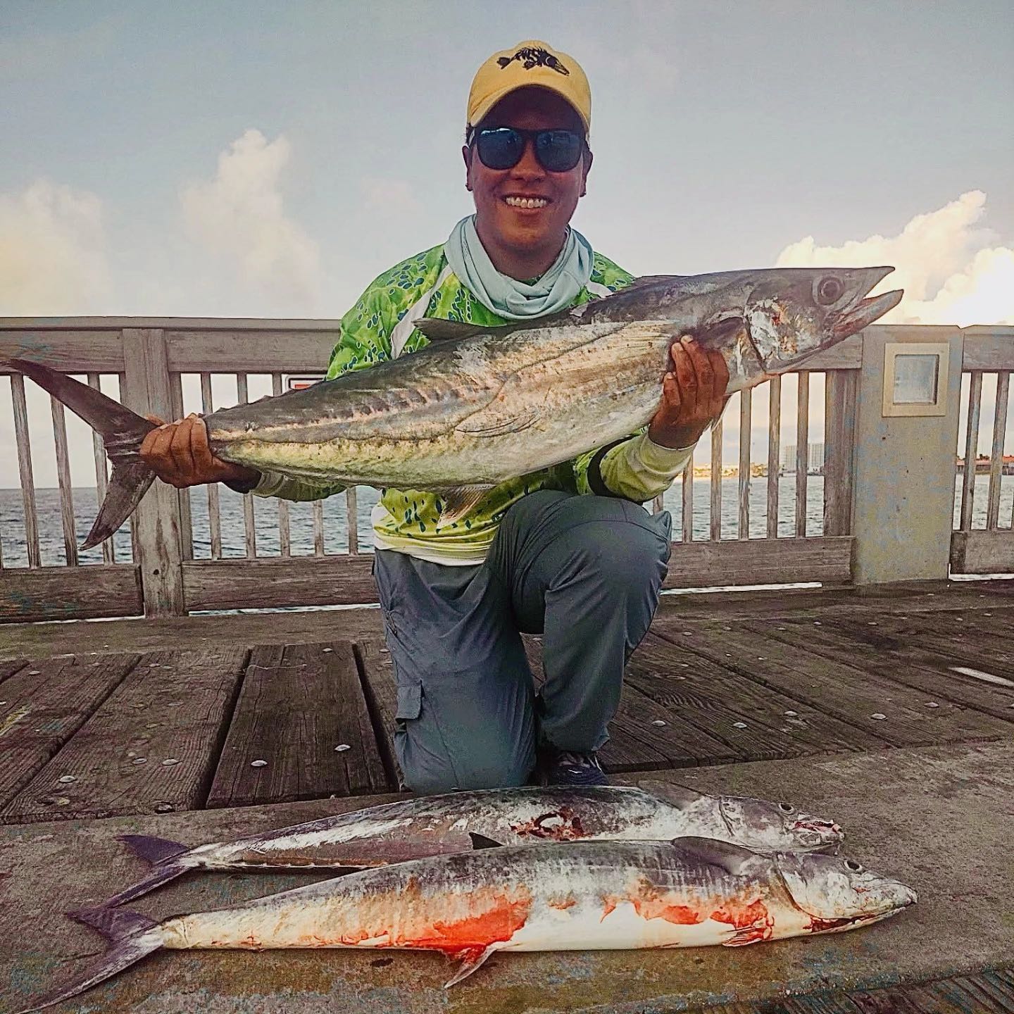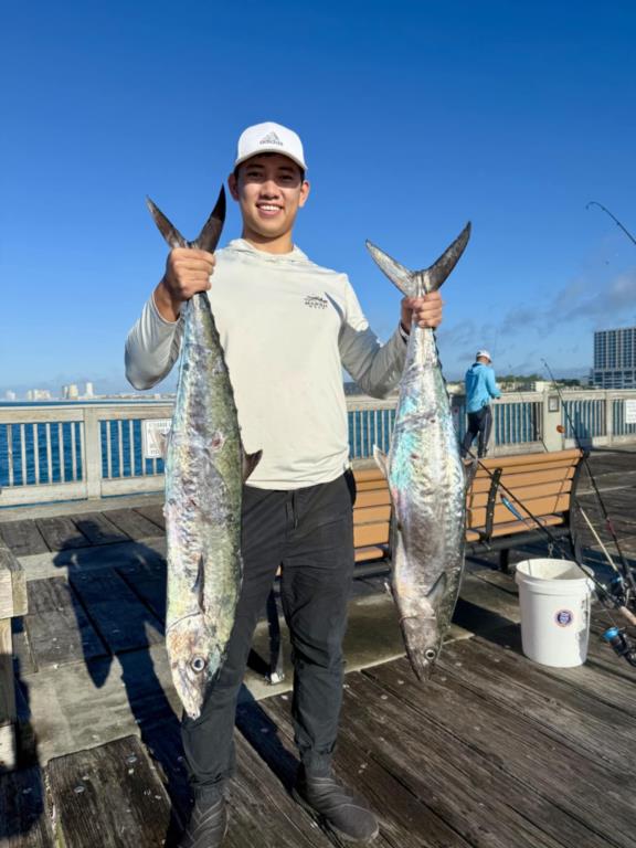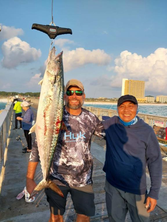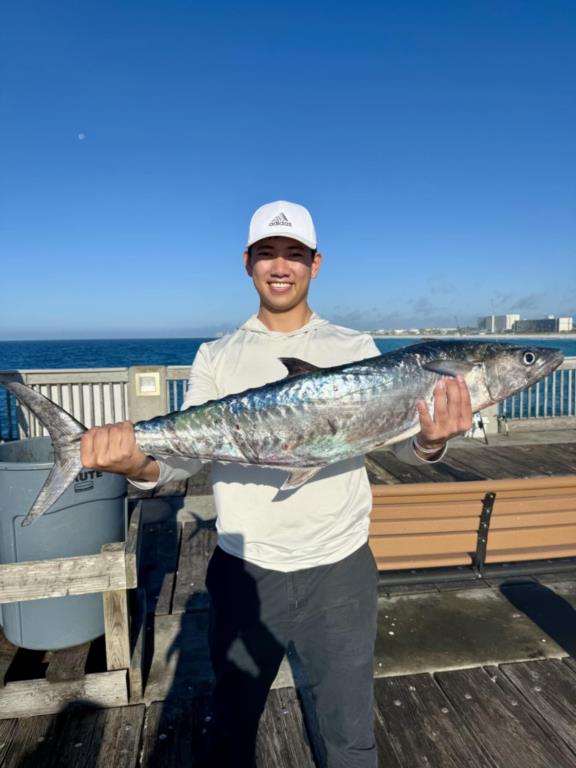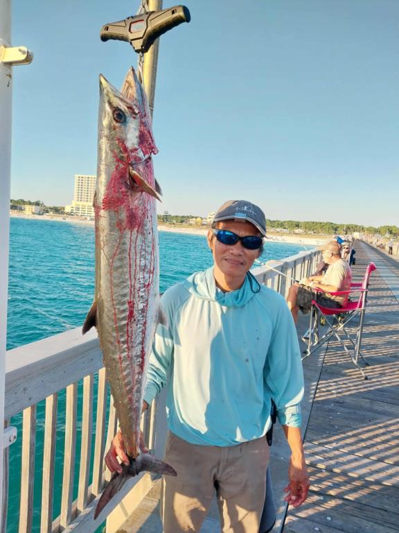 Friday: water temp 81.8 ENE 9-12mph in the a.m. / 73.2 SE 9-13mph in the p.m. The water was clean. There were about a dozen King Mackerel hooked in the morning with around 8 decked. One big King was spotted as it did a drive by on a bait but didn’t eat. The afternoon started and ended slowly with 6 King bites midafternoon. Jose was the only one to deck a “schoolie” King. Another large King was hooked and brought back pier side only to be lost in the pilings. A few Spanish Mackerel were caught. Several Flounder were caught and released. One small Bonita was decked by Quang.