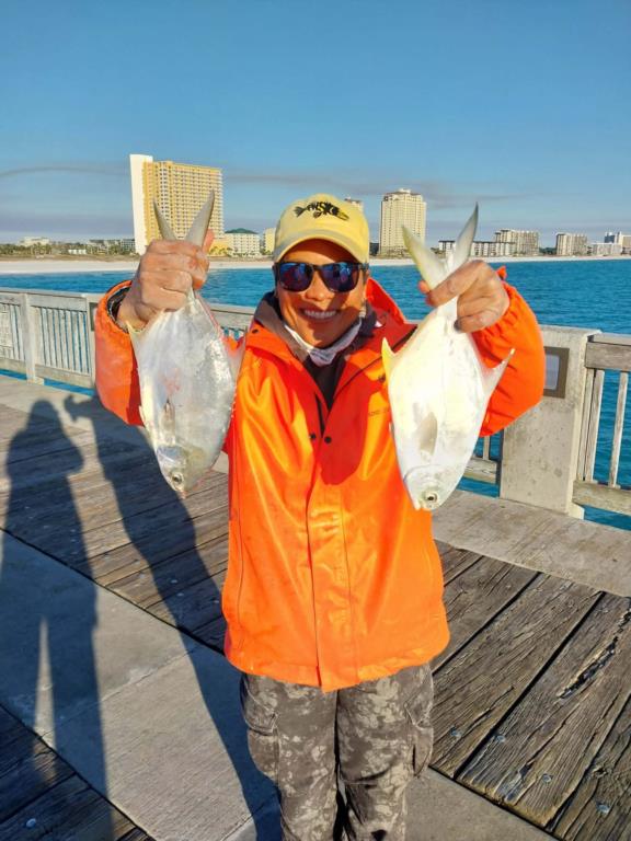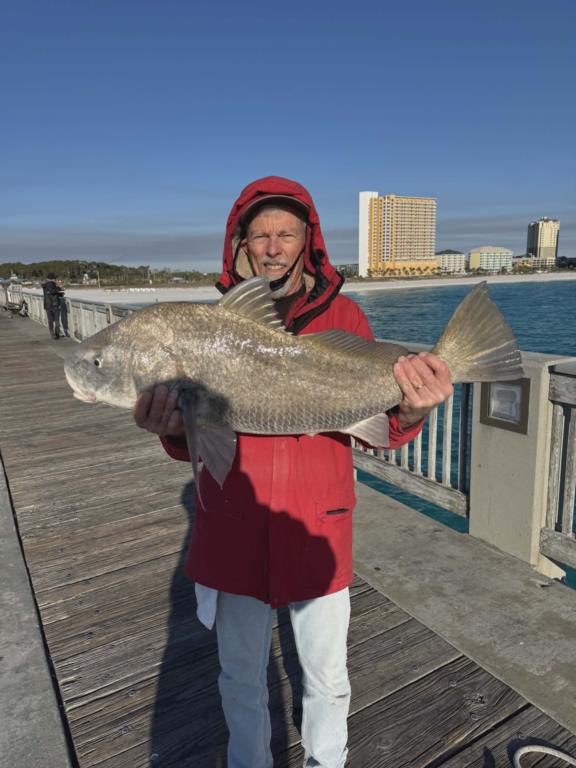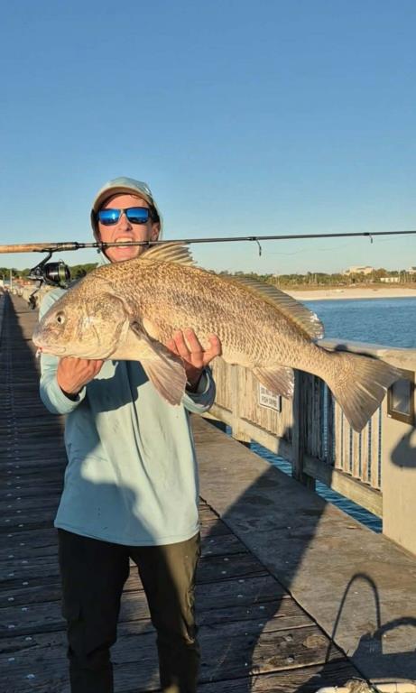 Wednesday 21st.: water temp 58.6 E 6-10mph in the a.m. / 57.6 SE 7-9mph in the p.m. The water was clean. The morning started cold and slow. Later the Black and Red Drum came in. Rob and Jack put nice ones on the deck. (see: Rob-14-345738b4; Jack-15-43a7060c, 16-1e6cd348)