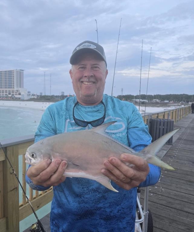 Tuesday: water temp 69.4 E 6-11mph in the a.m. / 71.8 SW 9-12mph in the p.m. The water was clean. A few Spanish Mackerel and Pompano were caught in the morning. The afternoon started slow, but the Spanish turned on about 5:00. There were schools coming through like this one Rick caught. Apparently, Pompano did too as George reached his limit. Butch had to get in on the action too.