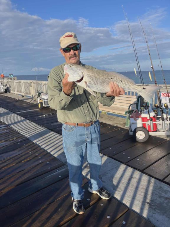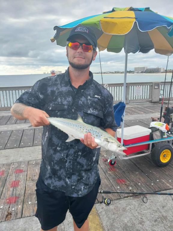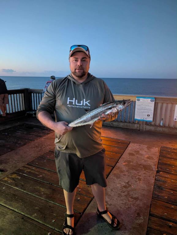 Thursday: water temp 84.6 SW 12-15mph in the a.m. / 84.6 W 5-11mph in the p.m. The water was clean. There was a very early morning King Mackerel bite. At least a dozen “snake” Kings hit the deck with a few Spanish Mackerel in the mix. The afternoon was slower with a half dozen snake Kings decked. Late afternoon, Dean from N. C. got a solid hit then a long screaming run. The fish took him deep into the backing on his reel. After a second run, Dean was able to bring the fish pier side on the west corner only to break off when the fish circled the gaff rope. It looked to be a solid 35 pounds if not more. There were also a few Spanish caught. There were Cigar Minnows, Alewives and Spanish Sardine available for live bait.