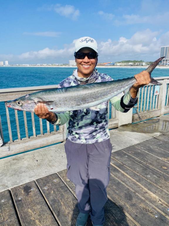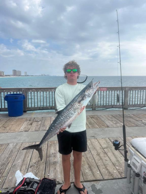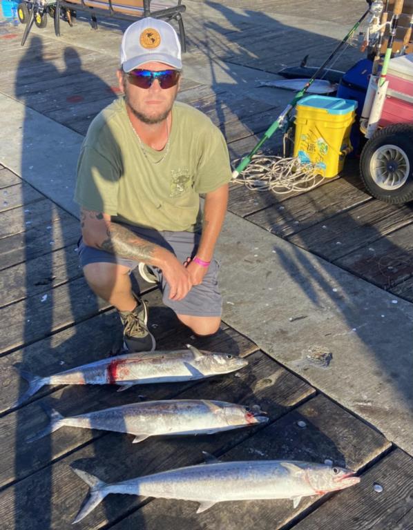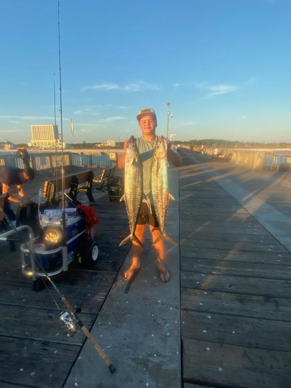 Sunday: water temp 72.1 NNW 5-9mph in the a.m. / 72.9 WSW 6-9mph in the p.m. The water was clean. The morning was dead except for a large Flounder and some trash fish. The King Mackerel bite exploded in the afternoon. There were around 20 Kings that hit the deck. Haden V. caught his limit. Jack G. and Hayden N. decked fish as well. Cigar Minnows were available for live bait. In other excitement, a sailboat drifted into the side of the pier. Apparently, the occupant had fallen asleep.