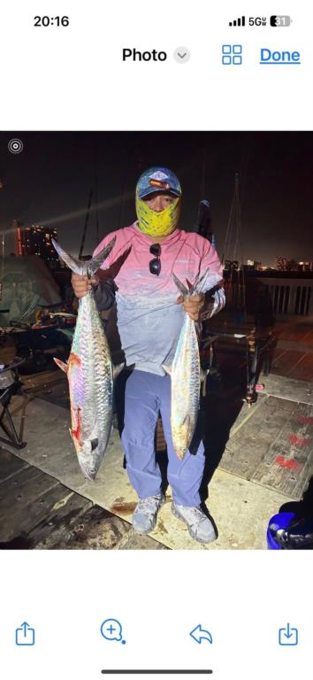 Saturday: water temp 72.1 S 6-8mph in the a.m. / 72.9 W 9-12mph in the p.m. The water was clean. There were three “schoolie” King Mackerel in the morning like the one Brenda is holding. The remainder of the day saw a few Flounder, a couple of Whiting and some trash fish. Late afternoon until dark there were a few more Kings. Dar Win holds a couple he decked. A few Cigar Minnows were around for bait.
