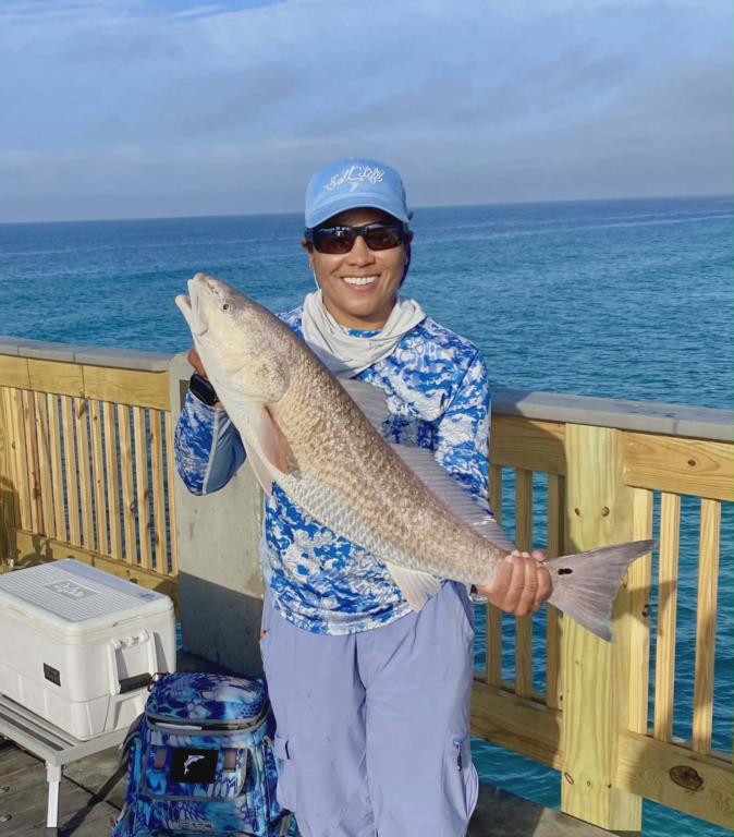 Friday: water temp 70.2 ENE 4-9mph in the a.m. / 73.9 SE 7-10mph in the p.m. The water was clean. There were over 20 Pompano caught throughout the day. Brenda reached her limit early in the morning and also decked a Red Drum. The Spanish Mackerel were thick with several anglers getting their limit of 15. Lorena, a first-time pier fisherwoman got her limit. Casey threw on a nice Cobia only to have it eat the Squid tipper off the jig and not eat the jig. Squid were being caught all day. Cigar minnows were caught in the early morning. None were around for the rest of the day.