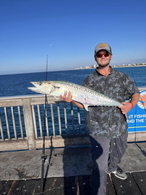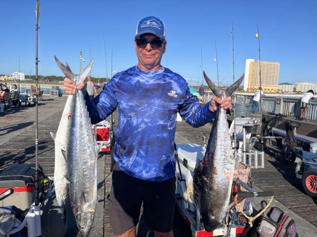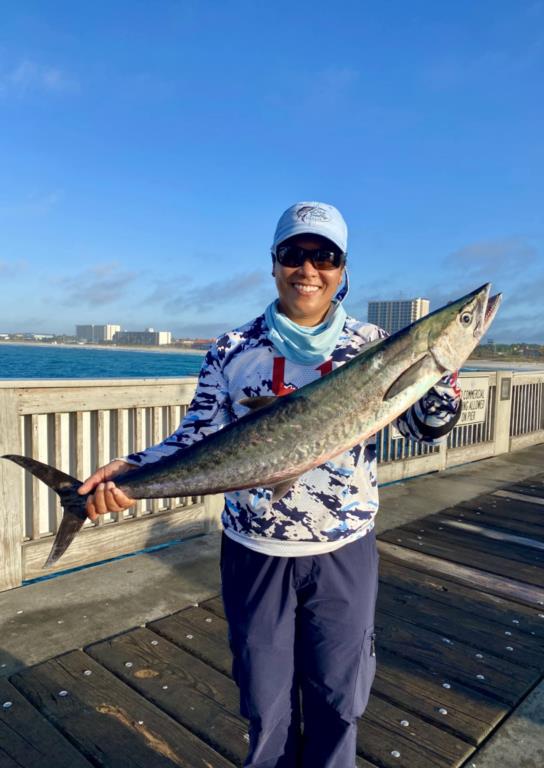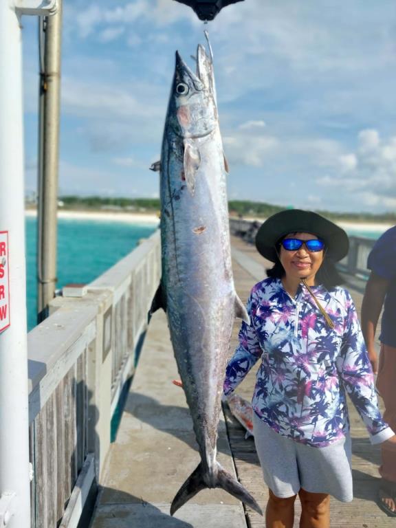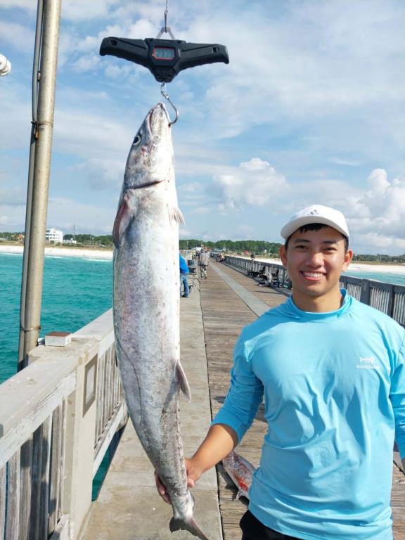 Friday: water temp 81.8 ENE 9-12mph in the a.m. / 73.2 SE 9-13mph in the p.m. The water was clean. There were about a dozen King Mackerel hooked in the morning with around 8 decked. One big King was spotted as it did a drive by on a bait but didn’t eat. The afternoon started and ended slowly with 6 King bites midafternoon. Jose was the only one to deck a “schoolie” King. Another large King was hooked and brought back pier side only to be lost in the pilings. A few Spanish Mackerel were caught. Several Flounder were caught and released. One small Bonita was decked by Quang.