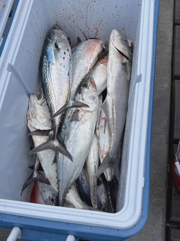 Sunday: water temp 60.8 SE 22-28mph in the a.m. / by 12:45 the wind shifted W 17-22MPH then WSW 17-21mph at 61.3 degrees in the p.m. The water was very rough but mostly clear. Strong winds and thunderstorms persisted in the early morning. The wind continued throughout the day. The Bonita finally came in and were hungry. Dom got eight during the morning weather. Terry H. got in on the action too. The water became dirty by late afternoon.