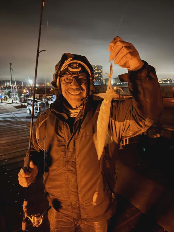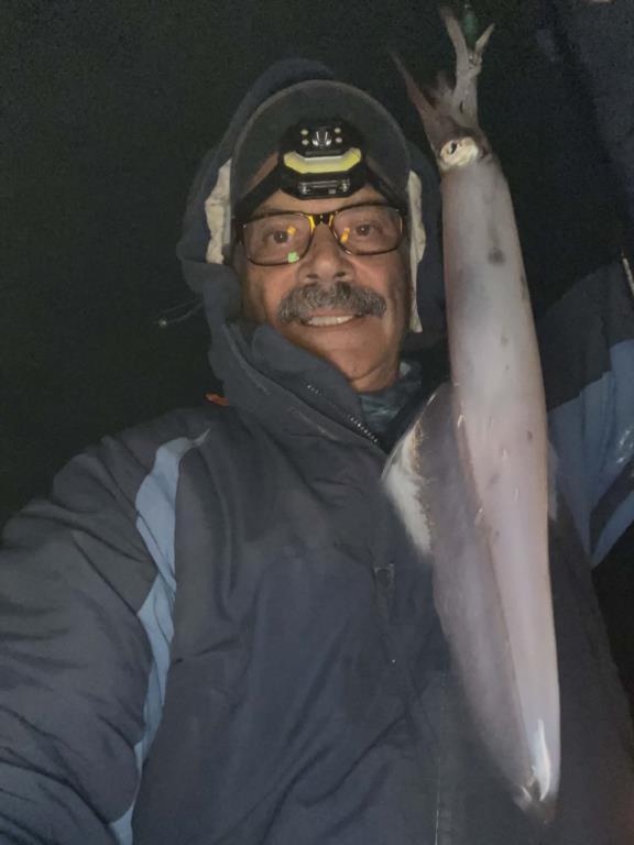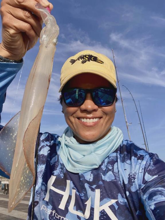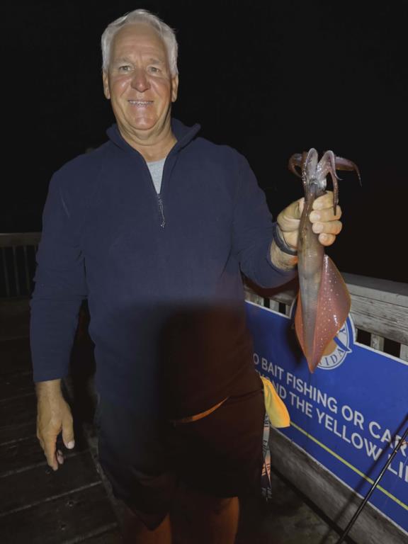 Thursday 12th.: water temp 70.5 NNW 8-15mph in the a.m. / 66.2 N 12-20mph in the p.m. The water was clean. Small Bonita were caught in the morning. Kim caught two. Paul D. hooked a giant Flounder but didn’t have access to a net. Unfortunately, the estimated 25-inch slab broke off while Paul tried to handline it. Last night the Squid were active. The biggest of the season were in like these Brenda, George and Jack caught. Jack’s Squid was the largest one any of the anglers have ever seen caught.