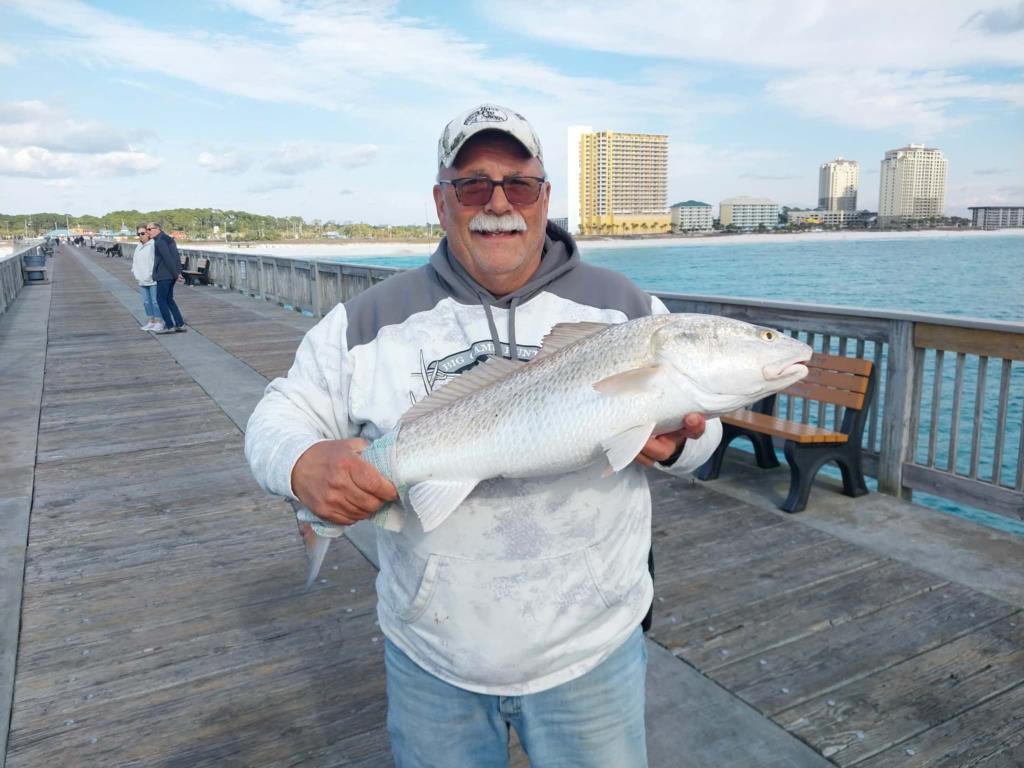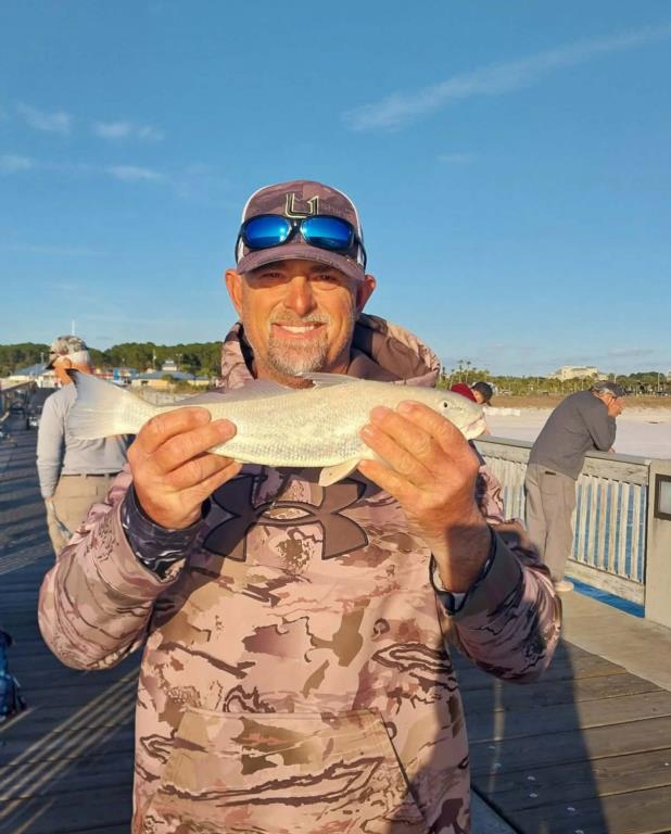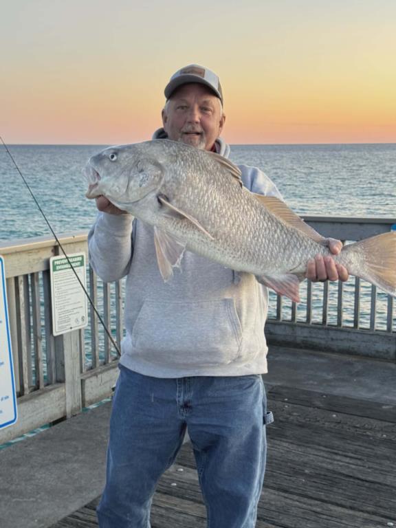 Wednesday 21st.: water temp 58.6 E 6-10mph in the a.m. / 57.6 SE 7-9mph in the p.m. The water was clean. The morning started cold and slow. Later the Black and Red Drum came in. Rob and Jack put nice ones on the deck. (see: Rob-14-345738b4; Jack-15-43a7060c, 16-1e6cd348)